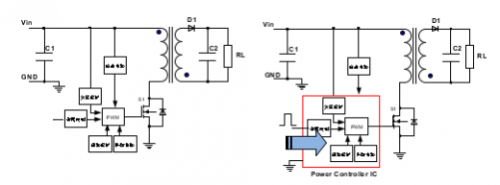 以及隔离反激式DCDC模块电源设计所用的PWM控制芯片,国内企业基本还是采用2843或3843等非常成熟普遍的系列芯片,然而这些芯片的功能已远远跟不上模块电源的发展需求,功能齐全、高功率密度、低成本、高电磁兼容性能是模块电源的必然发展趋势。所以一些二度集成和封装等新技术就油然而生,将一些外围功能电路全集成在芯片中,甚至包含主功率器件,如斜率补偿、欠压保护、短路保护、远程控制和开关管等,构成功能完美、外围器件极少和成本极低的集成芯片或模块,或是直接购置裸芯片,经组装成功能模块后封装,焊接于印制板上,然后键合。这也是当下的研究热点,国内主流企业和国际品牌,还有一些IC公司都已投入大量的人力和财力往这个方向去设计开发物料。像在小功率方面,现在很多IC公司(如TI)涉足电源行业,他们致力于将小功率电源封装成IC,然后自己生产、销售模块电源,成本则可以做得非常低,这将会给电源企业非常大的冲击,到时不得不低声下气的找IC公司合作,这也许是模块电源的发展趋势吧。