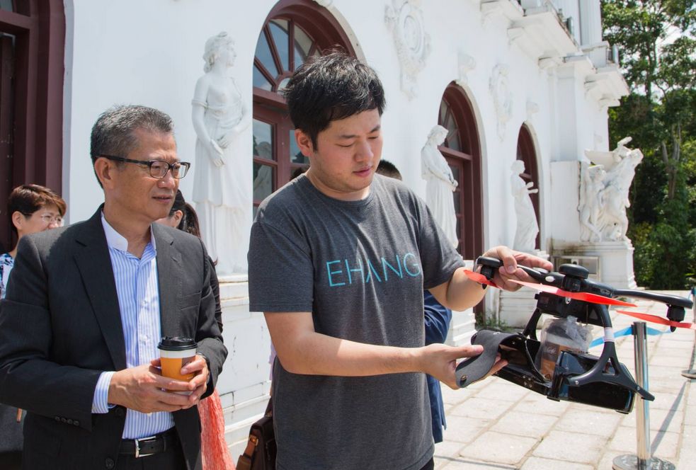 初到亿航智能,香港特区政府财政司司长陈茂波表示对公司多样化的技术应用表示惊叹,亿航联合创始人熊逸放以及亿航白鹭传媒科技董事长石哲元全程陪同与讲解。