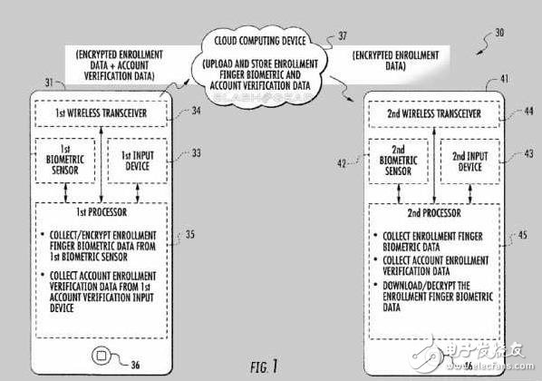 专利申请说明中,苹果称第一台设备的指纹信息会通过处理器采用特殊的加密算法,上传该账户的识别信息以及指纹生物特征信息至云端。需要接受指纹信息的第二台设备也会通过收集数据与云端指纹数据匹配,只有两者符合才会下载更多的云端加密指纹数据。
