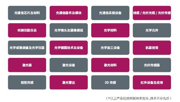 光学:光学镜头及摄像模组、光学材料、光学元件、光学成像测量及光学仪器、光学镀膜技术及设备、光学加工设备、机器视觉;